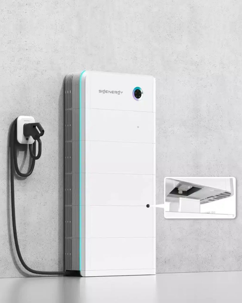 Weißer intelligenter Stromspeicher von Sigenergy mit angeschlossener Wandladestation – moderne All-in-One-Lösung für Energie- und Lademanagement im Smart Home fürs Eigenheim